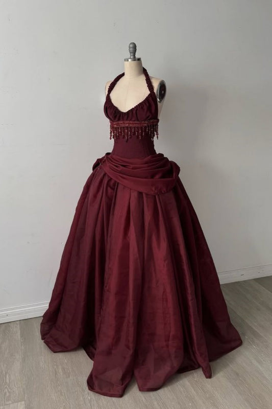 Halter Sleeveless Burgundy Satin Maxi Dress Luxury Elegant Tassel Waist Ball Gown for Gala Ball NV6299