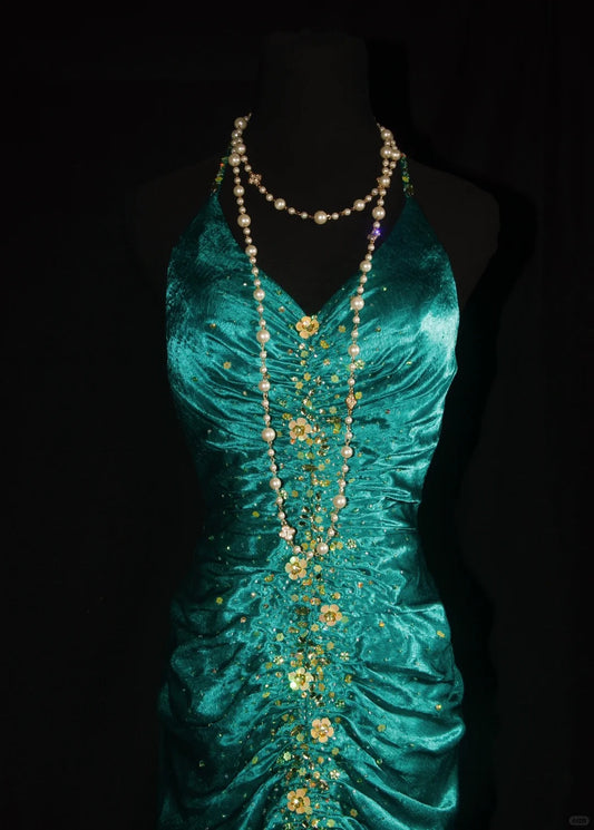 Green Gold Floral Delicate Beads Long Satin Ball Gown Evening Gown Party Dress nv4196
