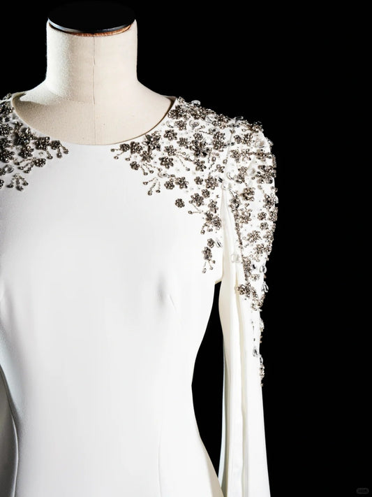 White Gorgeous Exquisite Beaded Long Satin Floor Length Mermaid Slim Ball Gown Evening Gown Wedding Dress nv4124