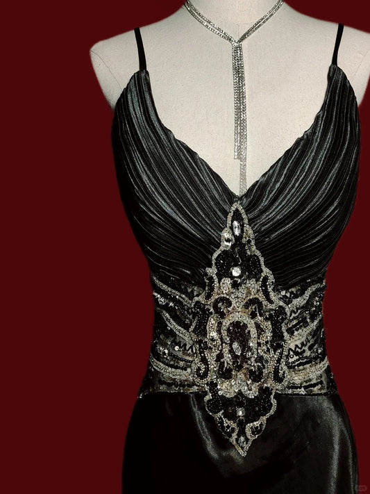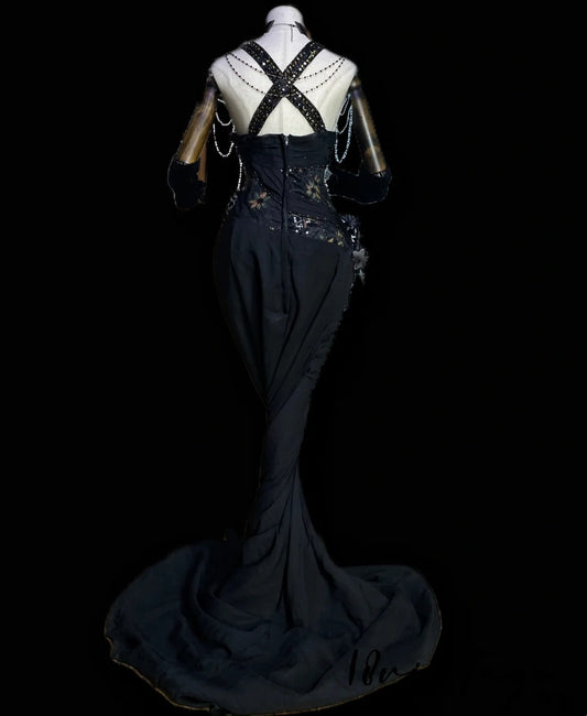 Black Vintage Fashion Gorgeous Floral Delicate Beads Long Mermaid Slim Satin Ball Gown Evening Gown nv4059