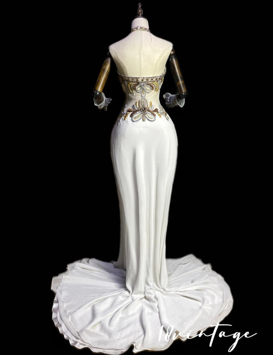 Ivory White Vintage Fashion Gorgeous Floral Exquisite Beading Long Mermaid Slim Fit Satin Ball Gown Evening Dress nv4060