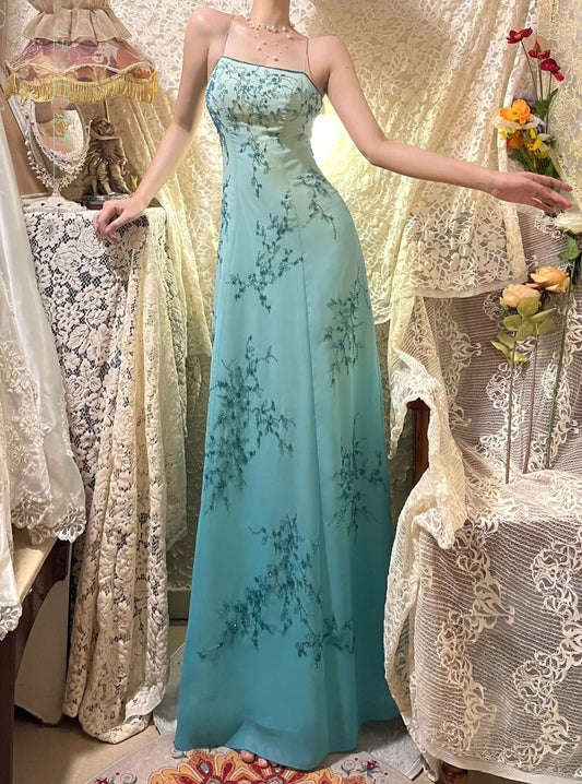 Blue exquisite beading vintage fashion floral long satin ball gown evening dress nv4315
