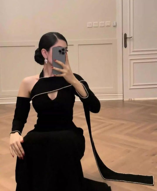 Black elegant long sleeve ribbon long satin prom dress evening dress nv3153