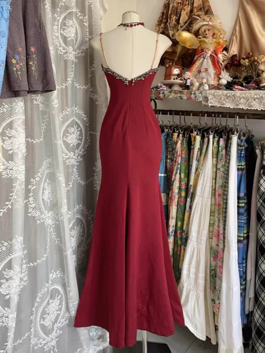 Burgundy Fashion Spaghetti Strap Long Sleeveless Mermaid Tulle Long Ball Gown Evening Dress Party Dress nv3574