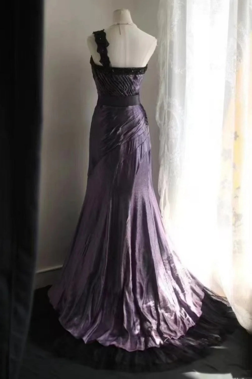 Purple Mist Mystery - One-Shoulder Black Lace Ruched Gown, Mermaid Train Elegant Dress NV6857