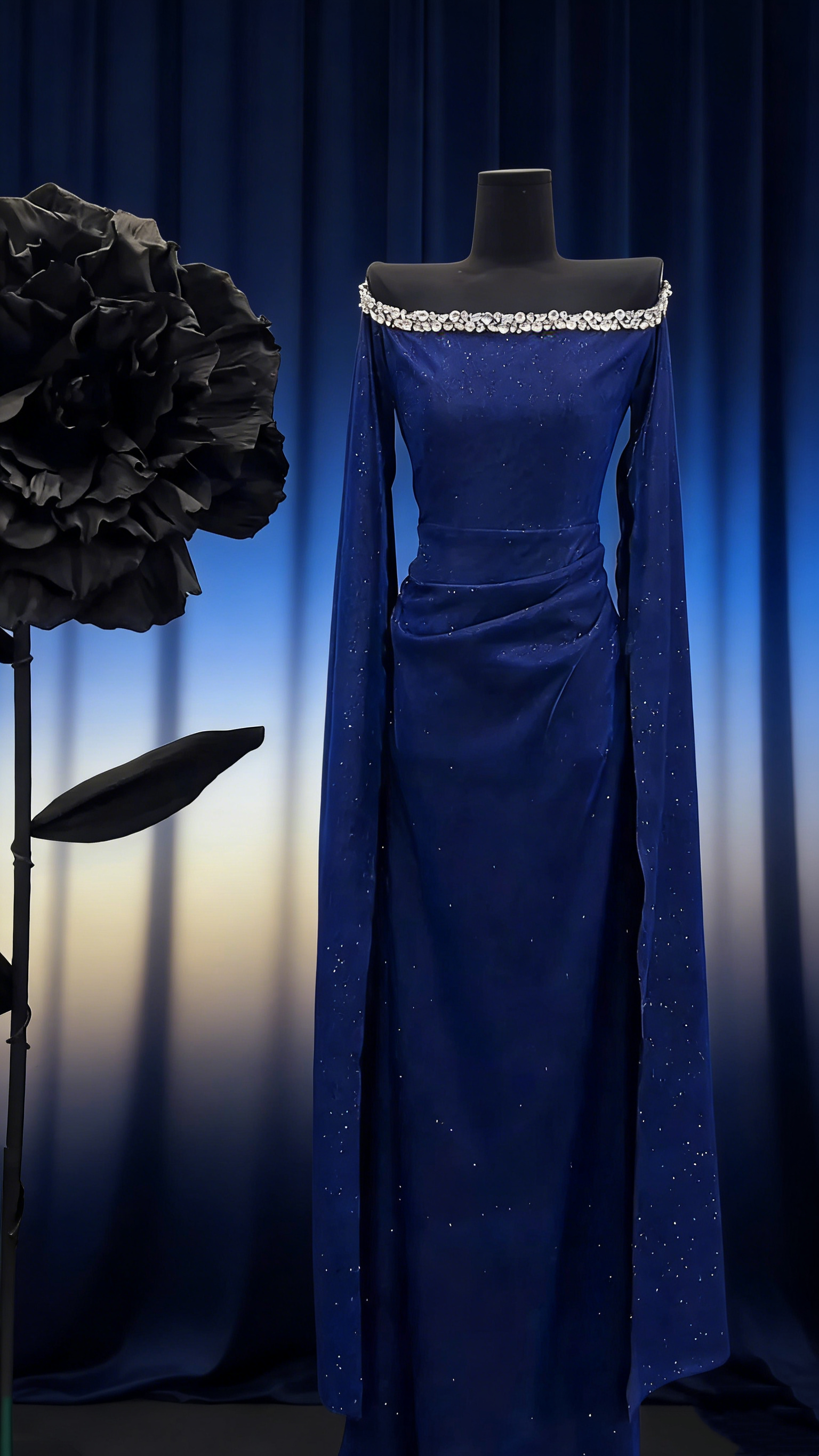 Royal Blue Shimmer Off-Shoulder Gown - Glamour Luxury Crystal Wide Sleeve Ruched Maxi Dress NV6800